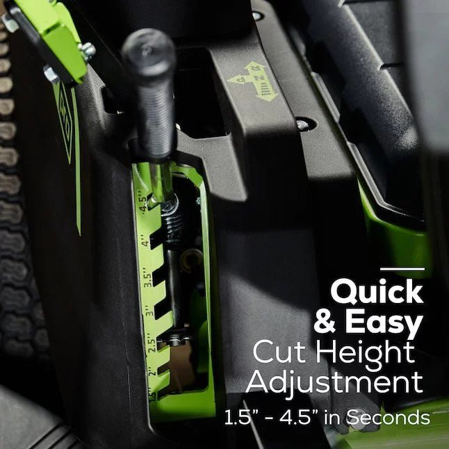 Greenworks electric riding mowers are here to level up your mow time. The Greenworks 80V CrossoverZ quickly cuts up to 2 acres on a single charge and never bogs down in tall, thick, or wet grass thanks to dual-cutting blade motors. Feel the unmatched power with zero-turn lap bar steering and four high-torque brushless rear-wheel-drive motors that mow at speeds up to 8 MPH and can tackle hills up to a 15° incline. When the job is done, fully recharge all (6) batteries in just 75 minutes. Greenworks’ unrivalled Intelligent Power™ combines TruBrushless™ motor technology, cutting, drive, control, and battery systems to sense and auto-adapt power for the job at hand—with a power output equivalent to a 24 HP gas-powered motor. Includes (6) 5.0 Ah batteries and (3) dual-port rapid chargers. Battery powers 75+ Greenworks 80V products and the 80V platform comes with a 4-year limited warranty.